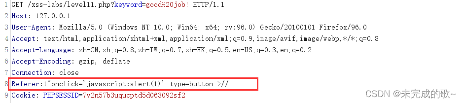 User-Agent:1" onclick='javascript:alert(1)' type=button > //抓包,修改 User-Agent 的值: